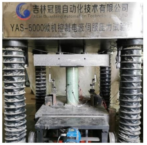 The test was conducted by the displacement controlled loading method on the YAS-5000 microcomputer controlled electro-hydraulic servo pressure testing machine. The loading rate of RCC, RCFGT1, and RCFGT2 was 0.003 mm/s. The loading rate of RCFGT3 and RCFGT4 was 0.007 mm/s. The loading rate of RCFSTs was 0.005 mm/s before steel tube yielding and 0.012 mm/s after steel tube yielding. The photo of the specimen in the test is shown in Figure 9.