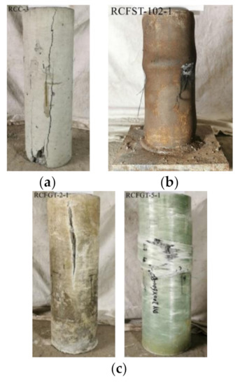 For RCC specimens, the tests were terminated when vertical or oblique cracks occurred on the column surface and increased rapidly. The unconfined RAC columns failed suddenly, due to the loss of bearing capacity with vertical-through crack and partial crushing of RAC. The typical failure modes of RCC specimens are shown in Figure 10a. For RCFST specimens, the column surface had no obvious change in the elastic stage; the middle and the end of the steel tube showed external bubbling after the limit stage; then the local buckling of the steel tube still developed without the loading loss. The typical failure modes of RCFST specimens are shown in Figure 10b. For RCFGT specimens, the tests were terminated when the rupture of GFRP tube occurred. However, there were different failure modes of RAC in the GFRP tube: For the RCFGT specimens with a weakened confining effect, the failure part was largely distributed along the vertical direction and the crack occurred and developed on the core RAC column; for the RCFGT specimens with a large confining effect, the failure part was focused on the mid-height of the column and the core RAC crushed in the failure sections. The typical failure modes of RCFGT specimens are shown in Figure 10c.