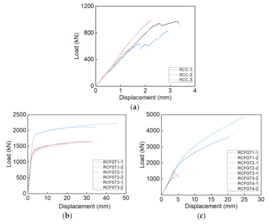 Figure 11a shows the load-displacement curves of the RCC specimens, the descending sections of curves are not measured, due to the brittle failure of RAC. Based on the test results, the following curve characteristics can be drawn: (1) The elastic stage is a large part in the ascending stages; (2) the specimens fail suddenly after the peak load; (3) the load increases slowly after suddenly falling down. This is due to the fact that: The high brittleness leads to the large elastic stage of RAC; the weak properties lead to the early crushing of recycled aggregate and some crushing aggregate would bear the loading again, due to the filling effect.