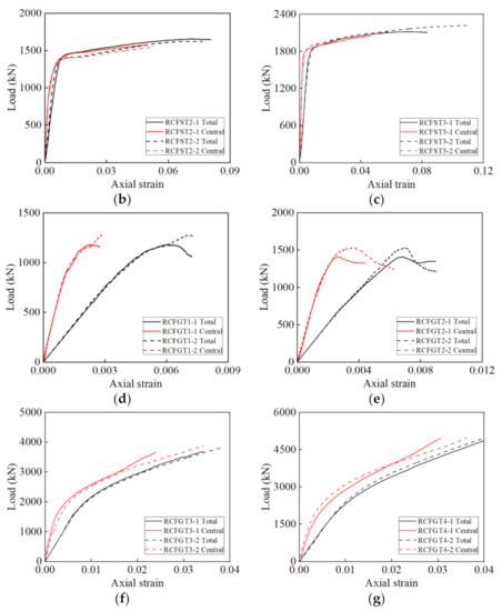 The comparisons in Figure 12 show differences between the axial total strain and axial central strain in the load-axial strain curves of the RCFST and RCFGT specimens. For the curves in Figure 12, the total strain is the ratio of displacement measured by two LVDTs to the specimen height, the central strain was measured by three axial strain gauges. The curves in Figure 12 show that: The growth of the central strain is much slower than that of the total strain in the first increasing stage, the central strain is less than 1/3 of the time of total strain in the early loading; the growth rate of the central strain increases to the similar rate of total strain at the following loading stage, the central strain is still less than the total strain of all specimens; and the central strain cannot be measured before the loading stop, due to the concrete damage or local buckling of steel tube.