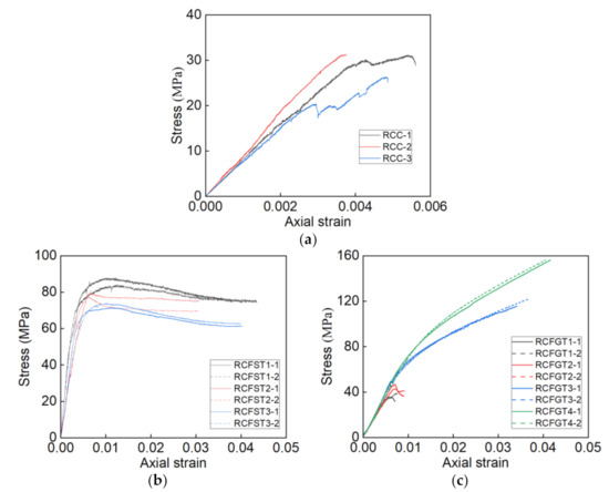 In total, 17 specimens were prepared and tested in this experiment, including one triplet of RCC (three specimens), three pairs of RCFSTs (six specimens), and four pairs of RCFGTs (eight specimens). The design sizes of all test specimens were summarized in Table 8. For convenience of analysis, each test specimen was given a name: The name starts with several letters to distinguish the specimen type, followed by a number (i.e., 1, 2, 3 or 4) which indicates the size of the steel tube or GFRP tube, the name ends with a number after a dash (i.e., 1, 2 or 3) to distinguish the two or three identical specimens of each pair. It is noted that the sizes of RCFSTs are different from other specimens, due to the fact that these specimens are used to analyze more complex section forms in the following future research, including multiple confined RAC and complex confined RAC. Therefore, the stress-strain curve trends and the stress-strain data were greatly studied in this paper. The former was used to study the behavior of core RAC in the steel tube. The latter was acknowledged as original data for theoretical analysis.