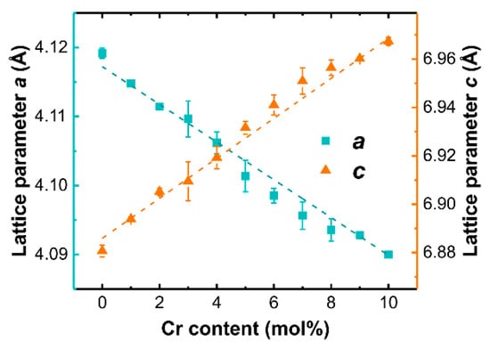 Gradual changes of lattice parameters with an increase of Cr content were detected (see Figure 3), suggesting the incorporation of Cr ions in the LaOCl lattice. In the case of isovalent substitution, Cr3+ ions are expected to incorporate in La3+ positions. Due to the smaller ionic radius of Cr3+ (0.615 Å) in comparison to La3+ (1.032 Å) [], a contraction of the LaOCl lattice resulting in a decrease of the lattice parameters a and c is expected.