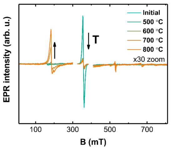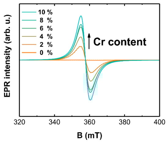 X-band EPR spectra of 1% Cr samples annealed at different temperatures in the H2/Ar atmosphere are shown in Figure 9.