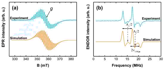 The EPR spectrum exhibits a well-resolved HF structure with approximately 1.15 mT average separation between the lines, which corresponds to a HF coupling value of A ≈ 32 MHz. The number and relative intensities of the lines could be tentatively accounted for in a model with S = 1/2 interacting with four equivalent nuclear spins I = 7/2. From the naturally abundant nuclei in the LaOCl matrix, only 139La have I = 7/2. ENDOR spectra, in general, are determined by the relative magnitude of HF and nuclear Zeeman interactions []. The fact that we observe the ENDOR signal at A/2 ≈ 16 MHz implies that our case corresponds to a Larmor-split HF-centered doublet. Consequently, the nucleus responsible for the EPR spectrum HF structure can be identified from half the distance between the ENDOR lines. As a result, we can estimate that the Larmor frequency is 2.1 MHz directly from the experiment, which is close to the value of 139La at B = 345 mT (the magnetic field at which ENDOR was acquired). The asymmetric shape of the ENDOR signal suggests that the HF interaction is anisotropic. A spin-Hamiltonian (SH) with axial HF interaction was used for EPR and ENDOR spectra simulations: