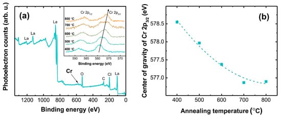 The XPS spectrum contains strong signals of La, O, and Cl; however, Cr signal intensity is miniscule due to the relatively low doping content. Nevertheless, two peaks can be resolved in the Cr 2p transition range, which correspond to Cr 2p3/2 and Cr 2p1/2 spin-orbit splitting doublets. The aforementioned peaks monotonously shift toward smaller energies, when the annealing temperature is increased. Complex multiplet splitting of Cr peaks with up to five components has been demonstrated for different compounds []. To establish the effect of the annealing temperature on the XPS signal of chromium, the binding energy of the 2p3/2 peak was calculated as a sum of weighed binding energies of the subpeaks for every annealing temperature. The obtained dependency is shown in Figure 6b. A summary of binding energy values for the 2p3/2 peak in chromium oxides is given in Table 1.