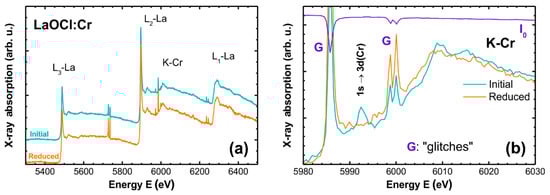 Experimental XANES spectra recorded in the range of the La L1,2,3-edges and Cr K-edge for 2% Cr LaOCl samples before and after heat-treatment in H2/Ar at 800 °C for 2 h are shown in Figure 7. As one can see, the Cr K-edge is located between the La L1 and L2 edges that complicates its analysis. Moreover, the XANES spectra are distorted by the presence of several “glitches” (Bragg reflections from the crystal monochromator), which occur as vertical spikes. Glitches can be uniquely identified by inspecting the I0 signal measured by the ionization chamber located before the sample. Three of them (one at 5985.8 eV and two at 5998.8 and 6000.1 eV) are, unfortunately, located at the beginning of the Cr K-edge (Figure 7b). Nevertheless, there is a notable difference between the two samples. The as-prepared sample contains a pre-edge peak at 5992.4 eV, which is completely absent in the reduced sample. Besides this difference, there are also other changes in the fine structure above the edge, which distinguish the two samples: in particular, the peak located at 6015 eV is broadened in the reduced sample. The pre-edge peak is attributed to the 1s → 3d(Cr) transition, which is forbidden in a dipole approximation for geometries that possess an inversion center but becomes allowed in a non-centrosymmetric environment, e.g., tetrahedral [,]. This means that the treatment in reducing atmosphere strongly affects the local environment of chromium ions.