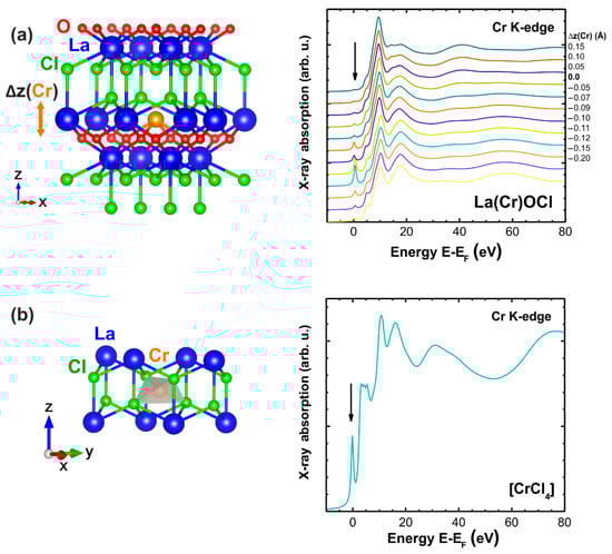 To discriminate between different structural models, the Cr K-edge XANES spectra were calculated as described above and are shown in Figure 8. In the case of lanthanum substitution (Figure 8a), the influence of chromium atom displacement along the c-axis by Δz = −0.20… + 0.15 Å has been additionally evaluated. The obtained results suggest that the pre-edge peak observed in the experimental XANES for the as-prepared sample can be reproduced using both structural models, i.e., a non-centrosymmetric environment of Cr5+ ions can be associated with their location in tetrahedral [CrCl4] (Figure 8b) or distorted [CrO4Cl4] (Figure 8a) surroundings. In the latter case, the chromium ions should be displaced closer to the oxygen ions by about 0.1 Å, which is favored by the smaller size of Cr5+ ions and stronger Cr5+-O2− Coulomb interaction. Upon reduction to the oxidation state 3+ in the reduced sample, the size of the chromium ions increases and the interaction with oxygen ions becomes weaker, which promotes the displacement of chromium ions toward lanthanum position or even slightly above it. Such displacement leads to a drastic reduction of the pre-edge peak intensity and a lowering of the amplitude of the peak located at 15–20 eV above the Fermi level in Figure 8a (it corresponds to the peak at 6015 eV in the experimental XANES in Figure 7b). Thus, the substitutional model, in which chromium ions are located close to the lanthanum position, can describe the experimentally observed variations in the Cr K-edge XANES in the as-prepared and reduced LaOCl:Cr samples.