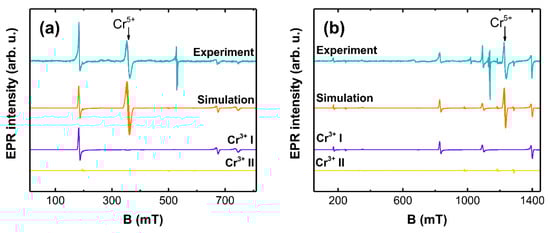 A gradual decrease of the Cr5+ signal intensity is observed as the reducing temperature is increased, which is accompanied by an emergence of additional signals over a broader field range. The number of features in the spectrum and the fact that EPR was detected at room temperature suggest the reduction of Cr5+ to Cr3+. EPR measurements at two frequency bands were performed for a more detailed analysis of the Cr3+ local structure; the results are shown in Figure 10.