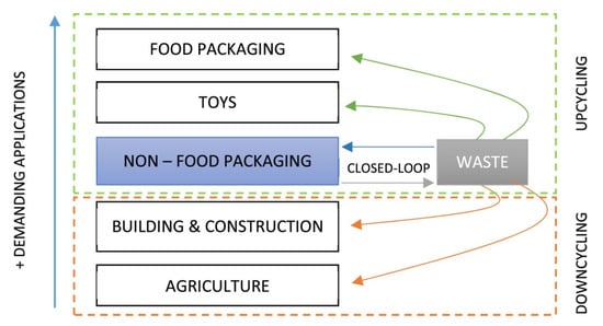 - Horodytska, O.; Kiritsis, D.; Fullana, A. Upcycling of printed plastic films: LCA analysis and effects on the circular economy. J. Clean. Prod. 2020, 268, 122138. [Google Scholar] [CrossRef]