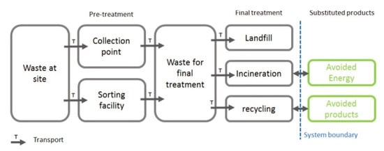 | [65] | Onsite sorting, transport, pre-treatment, distribution between landfill, incineration, and recycling | grave-to-grave |