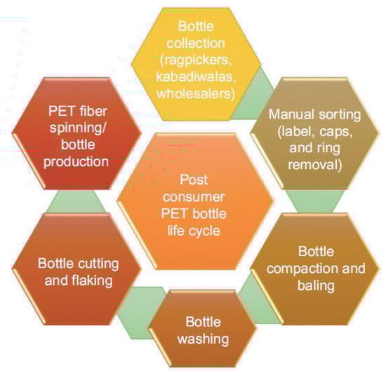 - Choudhary, K.; Sangwan, K.S.; Goyal, D. Environment and economic impacts assessment of PET waste recycling with con-ventional and renewable sources of energy. Procedia CIRP 2019, 80, 422–427. [Google Scholar] [CrossRef]