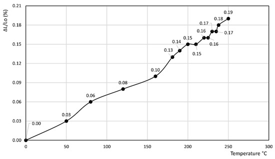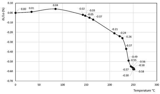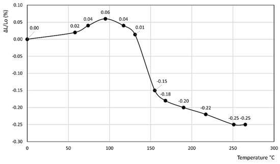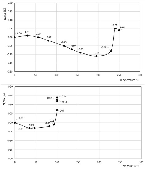 • In the latter curve, ΔL/Lo (%) slightly decreases up to 40 °C, attaining a value of −0.03%, thus attaining a plateau at this value in the 40–80 °C temperature range before finally increasing to a final value of 0.13% at 100 °C.