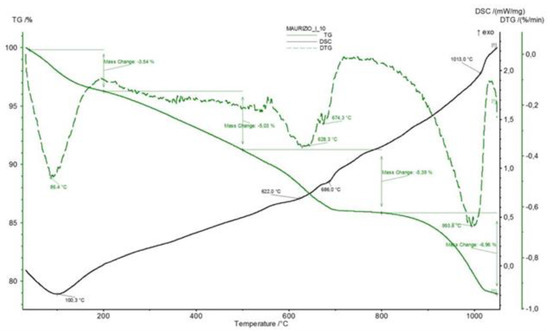 The thermogravimetric analysis (TG and DTG) of various rocks and plaster was performed up to 1200 °C using a Netzsch STA 449 F3 Jupiter Simultaneous Thermal Analyzer (Selb, Deutschland), equipped with Netzsch Proteus 6.1.0 software (V. 6.1.0, Selb, Deutschland).