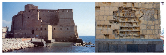 Figure 11. Example of the marked physical weathering of facia vista Neapolitan Yellow Tuff dimension stones, consisting of a marked consumption of their exposed surface assuming a typical concave shape (Castel dell’ Ovo, center of Naples, left: whole building, right: physical weathering; picture by A. Langella).