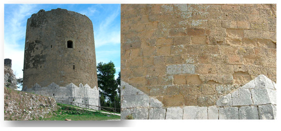 Figure 12. Example of the moderate physical weathering of facia vista Campanian Ignimbrite dimension stones (Mastio of the Caserta Vecchia Castle, Caserta Vecchia, left: whole building, right: physical weathering; picture by A. Langella).