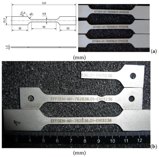 (a) Tensile sample geometry and purchased workpieces (showed quasi-brittle behavior) from company Effgen used in the current work; (b) samples including one after failure with another geometry together with the one in (a) for the same composite.