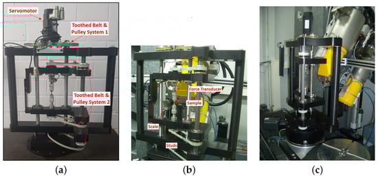 X-ray CT has the unique ability to observe the inside of the objects in 3D in a non-destructive way. This technique could exceptionally be helpful to observe the 3D damage evolution in the material under the condition that the X-ray CT scans are carried out during different loads. An in-house-designed test rig (RIF institute, Dortmund, Germany), which allows the rotation of the tensile specimen under load, was constructed for in-situ X-ray microscopy during tensile testing to achieve damage and displacement fields. Each component in this rig was individually designed by RIF and manufactured by different companies, and was completely assembled at RIF. The test rig consists of a synchronous servo motor coupled with two large studs through a toothed belt and pulley system (Figure 2a). The inner platform, consisting of the sample holder, force transducer, and a high precision absolute scale, rests on two large studs (Figure 2b). The large studs have left-hand threads for one half of the length and right-hand threads for the other half, ensuring that both ends of the inner platform move in the opposite direction with the rotation of studs during loading and unloading of the sample. The sample holding test rig of the inner platform is coupled to the rotating bed of the X-ray machine through another toothed belt and pulley system to rotate the sample during the X-ray CT scan (Figure 2c). The input and output of the whole test rig is controlled through the DOLi Test and Motion software at the personal computer connected to the motor and the sensors through serial communication ports and an electronic control box. The test rig was mounted in the GE X-ray CT machine available at LWT lab. The sample itself is mechanically loaded, utilizing the motor to drive the two spindles. The applied force is measured and recorded with the load cell. The elongation is also recorded through a displacement transducer. The sample holder can be rotated on the upper and lower holder and rotated through a laterally mounted axle and belt drive. In order to avoid the additional electric drive and angle sensors, the turntable GE vtome 240 computed tomography system was used for the drive. Thereupon, no change or adaptation of the CT measurement software is necessary. For the analysis of the samples, the XRadia 520 X-ray microscope from Zeiss [51,52,53,54], which allows a resolution of less than 1 m, was used in addition to the CT system. One sample was firstly loaded in tension with a conventional traction machine until it broke. Thereafter, using the obtained tensile stress-strain curve, load points for the CT images (for another sample or measurement) were then selected from ranges of elastic and plastic loadings.