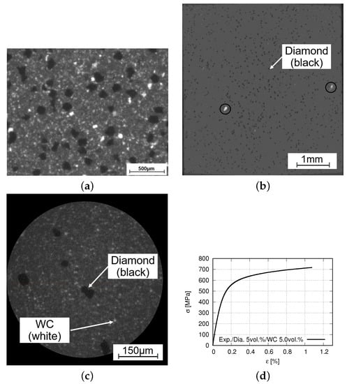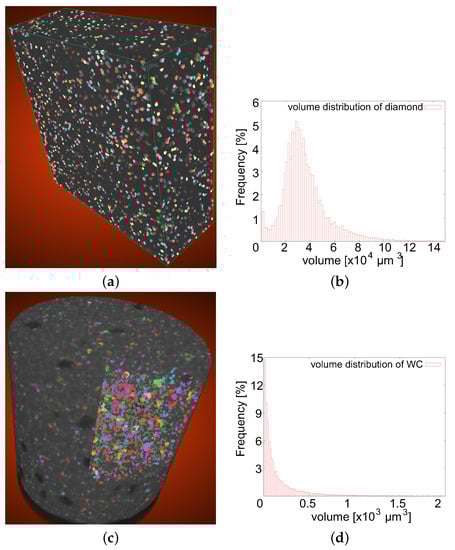 The 3D real microstructure of the Co/WC/diamond composite was represented with the aid of the in-situ X-ray CT. Such a tomographic scan is done perpendicular to the tensile loading direction, i.e., the loading direction is parallel to each tomographic image. The WC particles, which are small compared to diamonds, can be made visible by making the Co matrix phase thoroughly transparent. Figure 4a covers a volume of 3.5 × 3.7 × 1.3 mm, which includes more than 13,400 diamond particles. After recalculation of the scanned tomographic images, the mean volume of diamond particles (scan-A) is 3.67 × 10 m (Figure 4a), which corresponds to a diameter of about 50 m. Figure 4b shows the corresponding diamond volume distribution. In Figure 4c, the WC particles have a mean size of about 7 m in diameter. The total scan volume presented in Figure 4c is about 0.159 mm, which includes about 13,400 WC particles. Only WC particles with a volume higher than 9.99 m are considered in Figure 4c. In this case, the possible noises are excluded in the tomographic images. It is reasonable that the mean size of WC particles in the measurement (Figure 4c) is higher than the value given by the manufacturer (Table 1). Figure 4d illustrates the volume distribution of the detected WC particle. The remaining WC particles, i.e., the undetected and small ones, have sub-micron sizes and are very important for the particle strengthening effect in MMCs, since, according to Hall-Petch effect, smaller sized particles usually contribute more to the material strength compared to bigger ones.