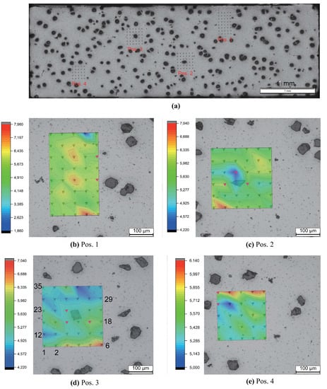Hardness distribution from HV0.3 nanoindentation tests after graphitization of diamonds (type-II quasi-brittle behavior): (a) the four measured positions (Pos.1 to Pos.4) on the surface; (b–e) the hardness distributions correspond to Pos.1–Pos.4.