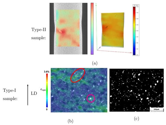 Measured local strain distribution: (a) results of image correlations from RIF e.V. (left, 2D DIC) and from VEDDAC [60] (right, 3D DIC), which is proved by Chemnitzer Werkstoffmechanik GmbH; (b) the measured local equivalent plastic strain [49,50] for the real microstructure shown in Figure 3a, where the arrow shows the loading direction; (c) the segmented WC phase of (b).