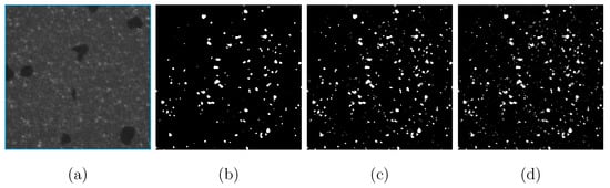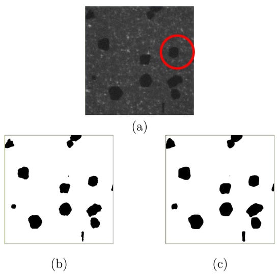 The subsequent work would provide the ground truth for the segmented results, e.g., using X-ray diffraction (XRD) technique or 3D EBSD, which will result in more accurate local features. I.e., due to limited time and facilities, no ground truth is available from experiments now, only the ones from manually segmented images. Here, it is assumed that the inaccuracy introduced by manual pixel sortation is negligible. To ensure a trustable segmentation result, the threshold method also segmented diamond particles for all the images. Both methods, ML and threshold, lead to approximately the same outputs. However, comparatively, U-Net (ML) can capture features in more detail. Figure 12a is a selected CT image, the diamond segmentation of which is compared in Figure 12b,c by using the median filter (threshold) method and the U-Net (ML) method, respectively. Figure 12b is the output with an aperture linear size of 7. Obviously, the U-Net process delivers better results since it captures the detailed features of the target object and can result in more smooth boundaries of objects. Diamond particles have polyhedron shapes, and each surface is smooth, i.e., not zig-zag curved. The reinforcement learning ability of U-Net is demonstrated in Figure 13 to capture the feature details. It is noted that the U-Net method in ML is not suitable for the segmentation of WC phase in the current images since WC particles are too small to achieve accurate training data. Meanwhile, the boundaries of WC particles are too ambiguous, which leads to high inaccuracy in ML. For the usage of U-Net, its advantage would be more pronounced when the images include more different objects compared to the current case with one object: diamond.