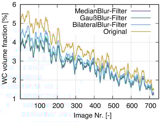 To obtain some knowledge of the denoising or segmentation quality, three different filters, median blur, Gaussian and bilateral, are applied for WC phase segmentation in the CT image processing. The detected WC volume ratio is variable from one CT image (each pixel corresponding to one voxel) to another and used as the criterion for the quality evaluation of filters. For a good segmentation quality, the spectrum of the variance should be as low as possible since the WC particles are relatively very fine and continually distributed (i.e., the volume alteration from a local place to another should be small). Figure 14 illustrates the comparison results. The median filter and the Gaussian filter deliver approximately the same behavior for the WC volume variance and are taken as the better ones compared to the bilateral filter. It is pointed out that the original WC volume variance (without applying filters) is taken as possibly wrong (Figure 14), since the chance is nearly zero for WC phase that its volume fraction is locally higher than 5vol% (real composition). About half of all the WC particles are submicron-sized, i.e., the current CT scan cannot detect such WC particles. Moreover, WC particles are very fine, which leads to a reduced possibility of very high local concentration. These two reasons lead to the expectation that a local WC volume higher than 5vol% is nearly impossible. One common characteristic of the three curves is that the WC area fraction shows decreasing tendency from the first ( closest to X-ray source) to the last image (Figure 14), even though fluctuations are also presented in some subranges. This tendency is considered to be an artificial effect due to the divergence of the X-ray beam, which is more serious with the increasing scanning depth into the material. As a result, the diameter of the X-ray beam increases with the increasing scanning depth, which makes it more difficult to detect small WC particles. As a visible illustration of this effect, the detected WC particle area fraction decreases according to the increment of the scanning depth.