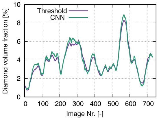 Two methods, threshold, and U-Net/CNN, are used to segment diamond particles. Figure 15 shows their segmentation qualities, where a relatively similar behavior of the volume variance is presented. The fluctuation of the volume ratio obtained by U-Net is slightly higher than the one obtained by the threshold method. It means U-Net can detect more detailed features of diamond particles, which are surrounded by a similar colored matrix. Furthermore, and from Figure 15, the diamond particles detected by U-Net are smoother ( closest to reality) than those detected by the threshold method. In conclusion, U-Net is the preferable method for the segmentation process of the diamond phase. Figure 15 provides information of the volume fraction of diamonds, which is very useful for selecting representative microstructure cut-outs for FE simulations.