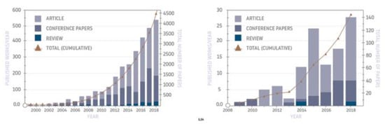 Summary showing the number of publications in recent years on geopolymers (left) and foamed geopolymers (right) (based on a recent review [10]).