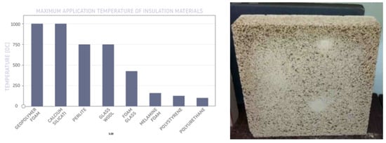 Maximum application temperature of some insulation materials, adapted from [12] and an example of foamed geopolymer panel (50 cm × 50 cm) (own research).