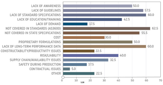 Respondents’ responses regarding barriers to geopolymer implementation [69].