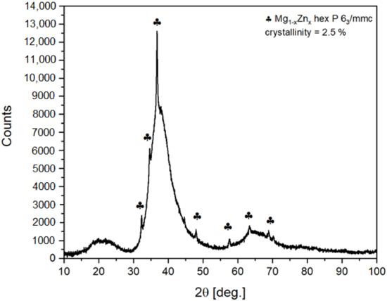 Quantitative and qualitative phase analysis of the ribbon was performed. This means that the ribbon was pulverized. The XRD pattern of the powdered ribbon at 300 K is presented in Figure 1. Traces of crystal structure related to Mg1−xZnx with space group P63/mmc were noticed. The crystallinity level was estimated to not be higher than 2.5%. The crystalline fraction of the sample was estimated by High Score Plus software. The procedure was as follows:
