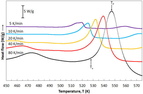 Ribbons of an amorphous structure (Mg72Zn24Ca4 alloy) were subjected to further investigations via differential scanning calorimetry (DSC). Investigations were based on continuous heating of ribbons with various rates: 5, 10, 20, 40 and 80 K/min. Figure 6 presents heat flow curves in dependence of heating rates. All DSC curves are characterized by the shape typical for metallic glasses. Peaks occurring in these curves allowed for the reading of various temperature values: temperature of the beginning of the crystallization process (Tx) and temperature of the crystallization peak (Tp). All these values are listed in Table 2. It is clearly seen that temperature values are increasing when the heating rates increase, indicating the glass-forming kinetics and a crystallization character. The influence of the heating rates on the crystallization process is caused by the thermal activation of the nucleation process, while the glass-forming kinetics is the result of relaxation processes within the glass transition region [35].