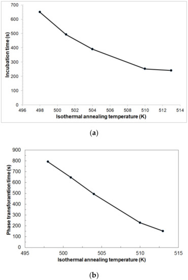 An increase in the isothermal annealing temperature causes a shortening of the phase-transformation times from 791 s for T = 498 K to 151 s for T = 513 K (Figure 8b). Isothermal annealing temperature also has a similar effect on incubation time, causing its shortening from 650 s for T = 498 K to 241 s for T = 513 K (Figure 8a).