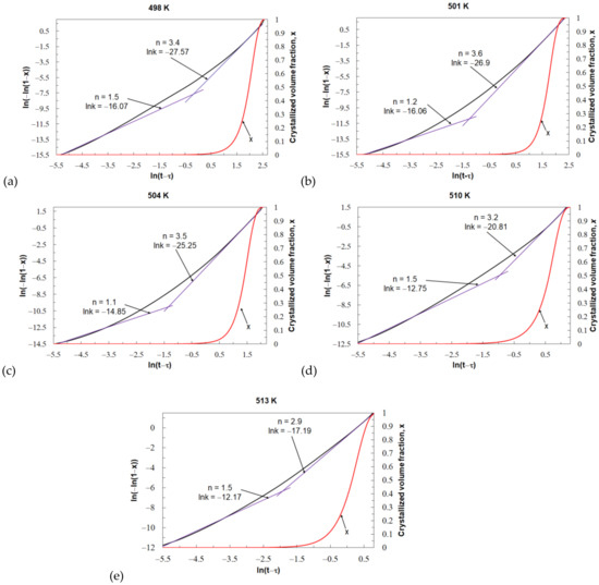 where x—volumetric fraction of the crystallized phase, t—crystallization time, τ—incubation time, and n—Avrami exponent, which depends on the number of embryo formation and growth geometry. The value should be close to 4 when there is sporadic nucleation and a three-dimensional growth reaction takes place. In the case where n = 3, the transformation is only three-dimensional growth to predetermined nuclei. When the Avrami exponent is equal 2.5, the transformation occurs at a constant nucleation rate and the growth is controlled by diffusion, whereas when n = 1.5, the transformation is based only on the growth controlled by diffusion. The letter k in Equation (1) is the reaction rate constant, which depends on the nucleation kinetics and nucleus growth. Values of parameters k and n can be determined by means of the dependence described by Equation (1), which, after appropriate rearrangements, can obtain the following form: