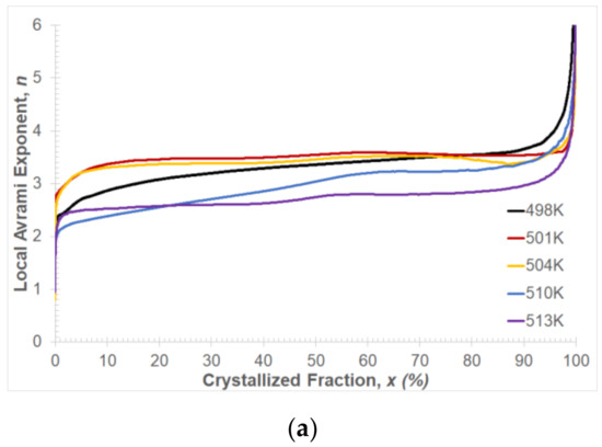 In order to investigate details of the crystallization process at a constant temperature, the local Avrami exponent n(x) was calculated by means of the equation [41]: