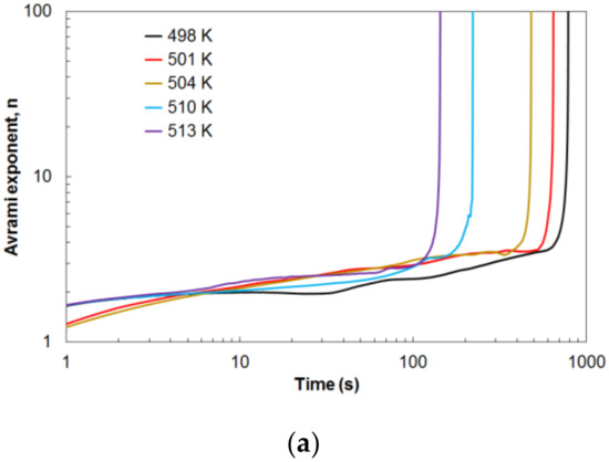 Figure 14 shows the influence of the annealing temperature on the average values of the Avrami exponent n and the reaction rate constant k. The Avrami exponent n increases at the beginning to reach a maximum value of about n = 3 at annealing temperature 501 K and then decreases to n = 2.5 at 510 K. The lowest tested temperature means a slow nucleation rate and depends mainly on diffusion. At 501 K, the highest nucleation rate was noted, after which it begins to decrease. This is the result of growth controlled by the interface. The reaction rate constant k constantly increases with the isothermal annealing temperature. This is the effect of the aforementioned faster crystallization process at higher values of temperature; therefore, the driving force of transformation is higher every subsequent tested temperature.