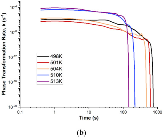 From the analysis of Figure 8a, certain incubation times are visible, depending on the isothermal annealing temperature, which are: 650 s for T = 498 K, 492 s for T = 501 K, 390 s for T = 504 K, 252 s for T = 510 K and 241 s for T=513 K. The incubation time decreases asymptotically with the increase in the isothermal annealing temperature. An increase in the isothermal annealing temperature shortens the duration of the heat effect and thus the actual duration of the phase transformation from 791 s for T = 498 K to 151 s for T = 513 K (Figure 8b). The phase-transformation time decreases in a nearly linear fashion with the increase in the isothermal annealing temperature. It can be stated that the increase in isothermal annealing temperature intensifies the kinetics of phase transformation.