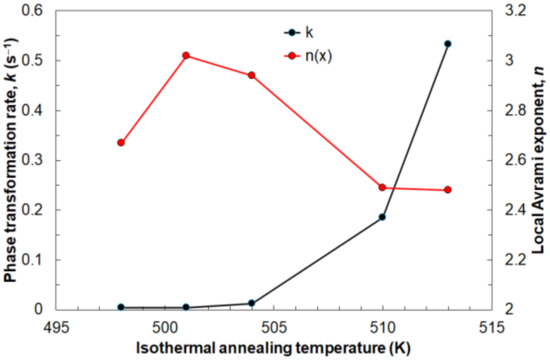 Kinetic parameters (n, k) for various temperatures of isothermal annealing.