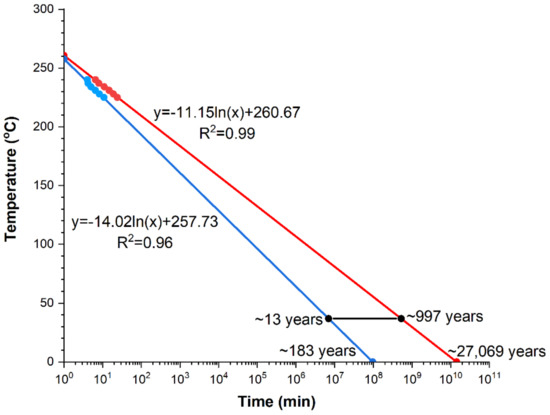 Investigations of the crystallization kinetics of the amorphous Mg72Zn24Ca4 also allowed for the determination of trend lines, suitable for predicting the times of the crystallization process at both the beginning and end for various temperatures of isothermal annealing (Figure 15). Both lines described by the equations: y = −14.02ln(x) + 257.73 and y = −11.15ln(x) + 260.67 for the crystallization beginning and end, respectively, were determined on the bases of the previously investigated-by means of DSC-points of the crystallization beginning and end. Determination coefficients are equal respectively: for the beginning of the crystallization process (R2 = 0.96) and the end (R2 = 0.99). According to expectations, the crystallization process is longer for lower temperature values of isothermal annealing. Since investigations were performed on the biodegradable amorphous alloy, the beginning and end of the crystallization process of the tested material at the human organism temperature, i.e., 36.6 °C, is marked by the black line in Figure 15. The expected beginning of crystallization under these conditions, occurs after approximately 13 years, while the end after nearly a thousand. Thus, the crystallization process at this temperature is very long.