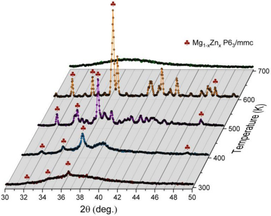 Additionally, XRD studies were carried out to identify phase components that appear while heating the amorphous ribbon to the temperature of 700 K. The kinetics of crystallization of the amorphous ribbon were also tested using the same technique for the temperature of 495 K. In Figure 16, nonambient XRD patterns collected between 300–700 K are gathered. The temperature of 5 K was approached within 5 min, followed by 5 min for stabilization and 20 min for measurement. The mean heating ratio was quite slow, yielding only K/min. As apparent, the amorphous structure is stable up to 385 K. Above that, value reflections of the hexagonal Mg1−xZnx phase begin to develop. The association of those reflections is presented in Figure 17. At the same time, the amorphous contribution is diminishing. Interesting behavior can be noticed around 38.5° of 2θ angle. Namely, when the Mg1−xZnx hexagonal phase forms, there appears a broad reflection starting from 385 K. This contribution is visible up to 480 K, where a number of small intensity reflections appear. It is worth noting that at this temperature, the amorphous contribution is lost, which is reflected in the significant decrease in the background level. At 515 K, another phase transition is observed, where aforementioned small reflections turn into a few well-defined ones with high intensities. This behavior is also clearly seen in Figure 17, when one compares patterns collected at 500 and 600 K. The sample started to melt at 620 K, and above that temperature, only some traces of the Mg1−xZnx phase are visible. Those traces, which persist up to 655 K, are probably related to the Mg-rich Mg1−xZnx phase. In the melted state, the diffraction pattern resembles the one collected at 300 K, with some shift toward lower angles with regard to thermal expansion.