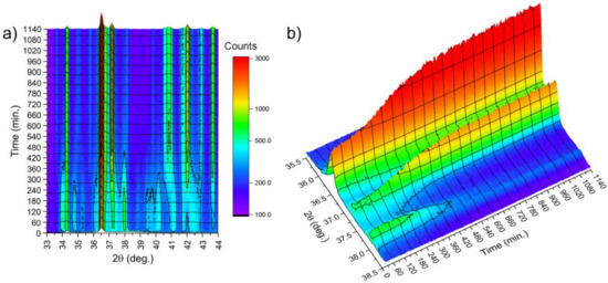 Evolution of XRD patterns with time at temperature of 495 K. (a) 2D view, (b) 3D view.
