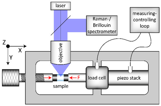 Scheme of the experimental setup used for the in situ uniaxial compression experiments. The load frame setup is arranged in the x–y plane and the excitation laser is incident from z-direction. The left compression piston uses a mechanical screw system for preloading of the sample (left red arrow). The right compression piston (right red arrow, F) is connected to the load cell and the piezo stack. This piston, integrated in a measuring–controlling loop, is used for high accuracy (±0.001 GPa) loading and constant conditions during observation (F).