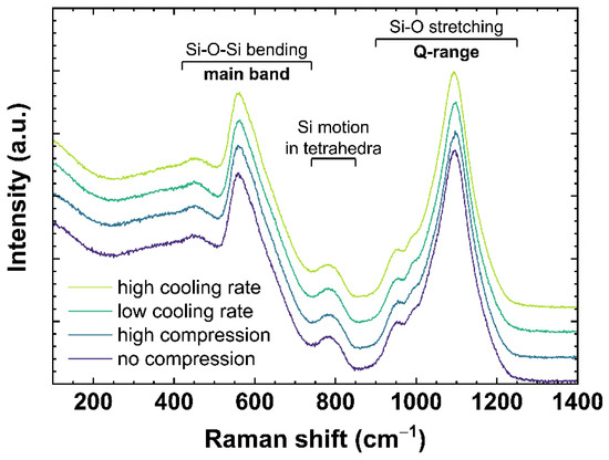 In the past decade, the processing of glass was extended by a vast range of new methods, especially by laser-based cutting [1,2], additive manufacturing [3,4,5] or direct structuring [6,7]. All these methods, also including more conventional approaches like molding [8], utilize temperature as a core element. The influence of temperature is often locally limited, and the subsequent cooling process is uncontrolled. This results in a rearrangement of the glass network based on a locally dependent cooling rate, affecting such properties of the glass as density or refractive index [9,10]. A locally rearranged glass network structure can further induce residual stress in the surrounding volume affecting the elastic properties of the bulk glass [11]. To understand how either the cooling rate or residual stress influence the behavior of the glass network, it is necessary to analyze both effects separately [12]. A known thermal history of a glass can be easily induced in the material by either a controlled cooling of the glass from a temperature well above the glass transition temperature (Tg), or by a conventional annealing process. Samples from both processes can be easily studied ex situ [13,14]. The influence of residual stress can be evaluated using isostatic or uniaxial compression tests monitoring the response of the glass network in situ or after treatment to a certain maximum pressure inducing permanent densification [15,16,17]. The changes in the glass network can be observed non-destructively using commonly used vibrational spectroscopy methods like Raman scattering and Fourier-transform infrared (FTIR) spectroscopies, as well as less common photoluminescence or Brillouin spectroscopy techniques. Residual stress or different cooling rates often assert themselves in a similar change of the spectroscopic properties, complicating the separation of these two effects. Therefore, a method to distinguish between both effects and to further analyze them quantitatively, is highly advantageous to assess the residual effect imparted by the manufacturing process. In this paper, we observe soda–lime silicate since it is the most prevalent type of glass in many aspects of everyday life as windowpanes or glass containers and accounts for the largest quantity of human-made glass [18].