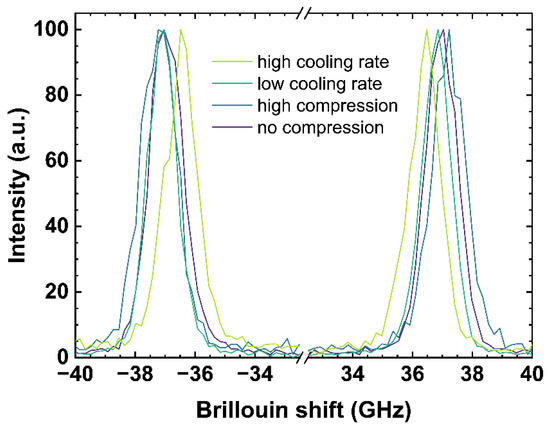 Figure 3 shows both the negative (anti-Stokes signal) and the positive (Stokes signal) Brillouin shifts. The anti-Stokes and Stokes signal were fitted using a Gaussian model and the arithmetic mean values of both signals were calculated to determine the Brillouin shift (BR). A difference in pressure or a change of the cooling rate rearranges the glass network structure and modifies the elastic constant associated to the speed of sound in the glass network inducing a shift in the observed Brillouin scattering bands [17,43]. High compression as well as a low cooling rate causes a Brillouin shift to higher frequencies due to a densification of the network structure.