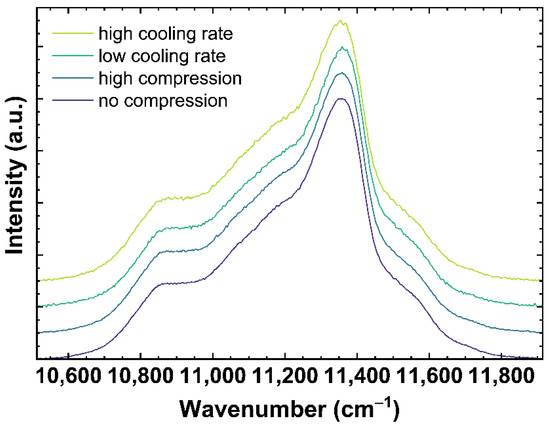 Figure 4 shows examples of Nd3+ luminescence spectra excited at 780.42 nm. The spectra correspond to the same samples as shown in Figure 2 and Figure 3. Modifying the network structure to a more densified state, either due to compression or lower cooling rates, is expected to decrease the distance Nd-O and, following the nephelauxetic effect, shifts the observed Nd3+ bands to lower wavenumbers [46,47].
