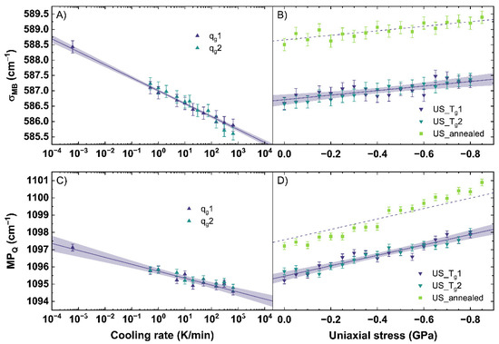 The obtained σMB and MPQ were calculated from the Raman spectra, evaluated for all observed conditions (different cooling rates, uniaxial stress), and are shown in Figure 5. A measurement uncertainty of 0.2 cm−1 was calculated from the resolution of the used CCD camera of the Raman spectrometer and the calculation error evaluating the spectra. Figure 5A shows the behavior of σMB for different cooling rates. qg1 and qg2 show a linear trend to lower wavenumbers with increasing cooling rate. A similar trend is observable for the MPQ displayed in Figure 5C.