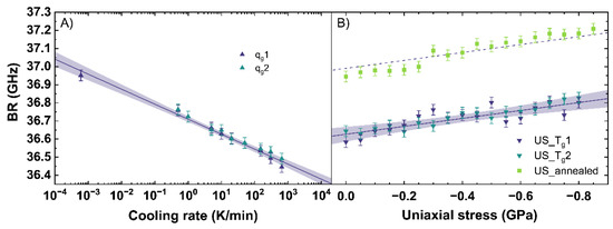 Figure 6 shows the evaluation of the BR observable depending on different cooling rates (see Figure 6A) and under different uniaxial stress (see Figure 6B). Similar to the Raman observables, the BR shows linear trends.