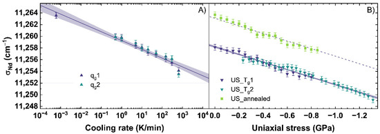It can be observed, that US_Tg1 and US_annealed intersect in their non-stressed state (0 GPa) with qg1 at the corresponding cooling rate, with which they were prepared. Corresponding to the behavior shown in Figure 5B, US_Tg1 and US_annealed demonstrate an identical trend with increasing uniaxial stress.