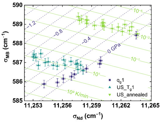 Figure 10 shows that our method of suitable observable comparison is also functional using just one spectroscopic observation technique, but at the expense of a higher uncertainty of this approach than the comparison of observable from two different spectroscopic techniques. However, this could be also based on the observables σMB and MPQ itself. σMB observes the behavior of the Raman spectrum in a range from 500 to 730 cm−1, resulting in a stable evolution of the parameter for a change of cooling rate or different uniaxial stress. This could be seen at the comparatively smaller error of the fit of σMB compared to MPQ (see Equations (5)–(8)). However, observing a range of the Raman spectrum decreases the specificity to small changes compared to monitoring a single band contribution or maximum position like MPQ. The effects of cooling rate and uniaxial stress can have similar evolutions in the Raman spectrum (see Figure A1 and Figure A2), and therefore it is crucial to deduce suitable observables from the Raman spectrum that describe only the effects of cooling rate or applied uniaxial stress. Comparing only optical (Raman) versus acoustic (Brillouin) light scattering, similar to the approach comparing Raman and Brillouin scattering versus Nd3+ photoluminescence, we observed no distinguishable behavior related only to cooling rate or applied uniaxial stress. This suggests that the two types of measurements are here sensitive to the same underlying structural modifications induced by changing the cooling rate or the uniaxial stress. The distribution of the angle Si–O–Si, directly observed by Raman spectroscopy, could indeed also affect the elastic properties in the same proportion. Thus, for our provided methods to characterize the network structure, regarding the applied cooling rate and uniaxial stress, the inclusion of REE like Nd3+ as a sensor is recommended. Other rare-earth elements like Eu3+, Pr3+ or Sm3+, providing a photoluminescence, can also be utilized as sensors to monitor cooling rate or stress of the glass network structure [47,60,62].