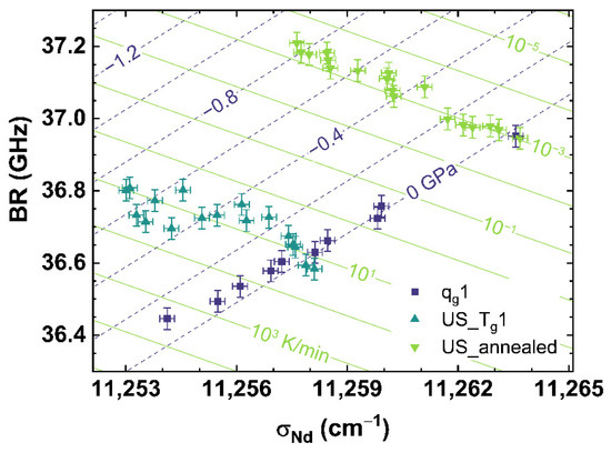 For this fit, a decrease of 6.48 cm−1 per GPa is calculated. The behavior of σNd is very different from the behavior of σMB, MPQ and BR. The Raman and Brillouin observables were consistent with the effect of increasing density, i.e., increased for the glass with higher density not depending on the origin of the densification by lower cooling rate or higher uniaxial stress. However, σNd shifts to lower wavenumbers with an increase of both, cooling rate and uniaxial stress. This could indicate σNd depends on the state of disorder within the network structure. Both, a higher cooling rate as well as higher uniaxial stress, should increase the disorder state of the glass network [58,59]. Data using the σNd-parameter as a sensor for cooling rate or uniaxial stress in the elastic regime has not been previously reported. Therefore, we could not make a comparison of our data in the elastic regime and those reported in the literature. Nonetheless, comparisons to plastic deformed glass in [51,60] reported in the plastic regime a decreasing, albeit non-linear trend to lower wavenumbers with increasing permanent densification, which should also induce a higher disordered state in the glass network.